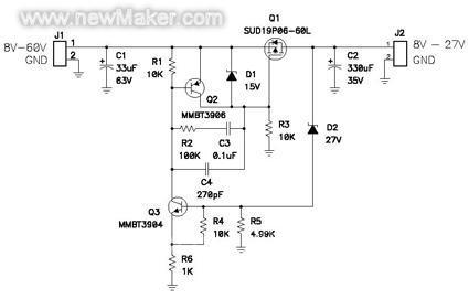 晶体管Q3采用了射极跟随(emitter follower)的配置,因而电流增益近乎为1。由于集极电流流经Q3,使Q2产生偏置,并开始降低FET Q1的门极—源极电压。由于FET Q1对流经其本身的、过高的输入到输出电压的抑制(起了线性稳压器的作用),使得输出电压被保持在了27.6V。随着输入电压的增加,输出电压不再增加,因为额外的电流将流经齐纳二极管D2并迫使Q2降低Q1的门极—源极驱动电压。该闭环反馈防止了输出电压继续变化。