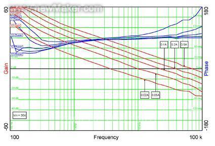 由R2、C3以及C4所组成的补偿网络提供了所需的频率修整。当未达到串联的R2及C3所引入的零点之前,Q2的增益以-1的斜率从直流(零频)点开始下降。该零点的位置被调整至50Hz附近。并联的R2及C4所引入的极点被调整至6kHz的零点位置。此时,总体的有效环路增益保持了-1的斜率,直至越过单位增益,如下图所示。示例的电路展示了最少70kHz的带宽,可支持大于0.5A的负载电流,在几乎所有的负载状态下都拥有90度的相位裕度。由于负载阻抗及输出电容设定了一个低频的极点,因此带宽将随负载阻抗的升高而降低。