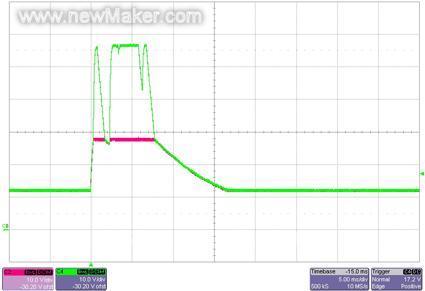 下图显示了在较大的不规则输入电压瞬变状态下输出电压的响应。一旦输入电压超过齐纳二极管D2额定的27V,输出电压将箝位并很好的抑制输入电压的改变。