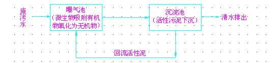中,曝气池中的微生物吸附污水中的大部分有机物,并且在曝气池中被氧化成无机物,然后在沉淀池中微生物絮体下沉,经过一段时间后,就可以输出清水,同时为了保持曝气池中污泥的浓度,沉淀池中经过沉淀后的一部分活性泥需要回流到曝气池中。