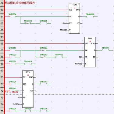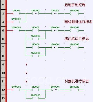 ①粗格栅机系统程序,完成粗格栅机和清污机的控制,系统梯形图如下。