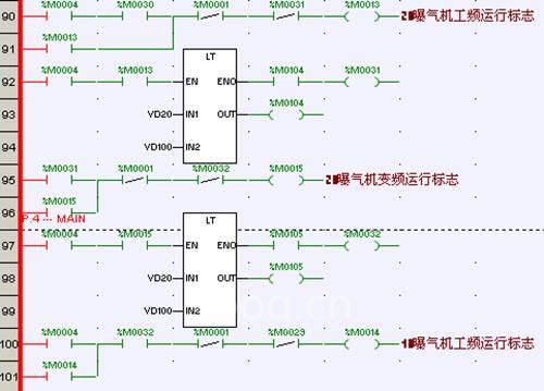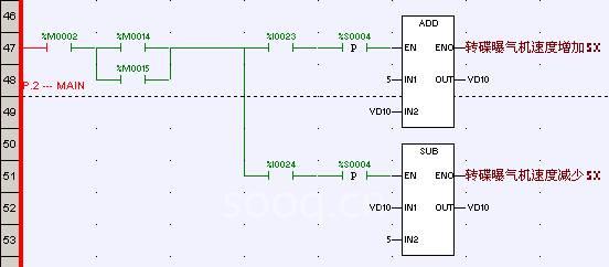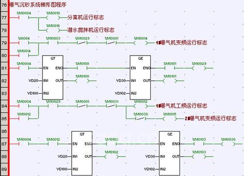 ②曝气沉砂系统程序,完成对转碟曝气机运行、调速及停止的控制,曝气沉砂系统梯形图程序如下。