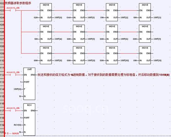 ③变频器读取参数程序,用于变频器的输出频率,变频器读参数梯形图程序如下所示。