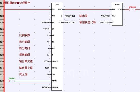 ④PID指令,用于模拟量的处理,输出数据AOUT到%QW0001,用于输出模拟量来控制其他设备的运行。