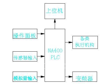 (1) 控制系统总体框架图:如图2所示,NA400 PLC为核心控制器,通过检测操作板按钮的输入、各类传感器的输入以及相关模拟量的输入,完成相关设备的运行、停止和调速控制。