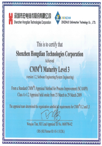 宏电公司顺利通过了CMMI三级评估认证, 并获得由SEI(美国卡纳基--梅隆大学软件工程研究所)授权签署和颁发的CMMI 软件工程和系统工程成熟度3级证书。至此,深圳宏电成为业内同时获得ISO9001:2000和CMMI三级质资的M2M行业终端及整体解决方案供应商。
