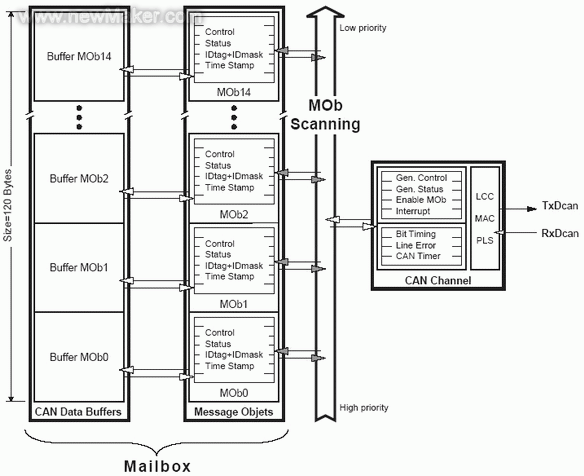 MOb是一个CAN消息帧的描述符。它包括处理一个CAN消息帧的所有信息。这意味着一个MOb可以看成一个对象,来描述一条CAN消息。MOb的数目是从0到14。它们相互独立,但在多重比较的时候,低位的MOb会获得优先权。每个MOb都被安置在一个页中来保存。页的序号就是MOb的序号。