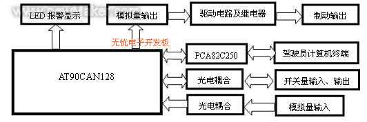 以AT90CAN128单片机作为控制系统核心,外围设有8路光隔模拟量输入、4路模拟量输出、多路光隔开关量输入、输出、LED报警及CAN总线收发器,总线的接口芯片选用的是Philips公司的PCA82C250。具体结构见图2。