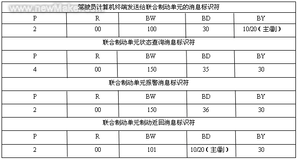 表1定义了驾驶员计算机终端及联合制动单元之间相互通讯的消息标识符。