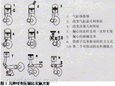 图1示出了一些基本方案的原理。其中,方案(1)将气缸和气缸盖相对于曲轴移动一个位置,发动机气缸体在一定程度上“掀开”了盖子,因而压缩比可以变动,不久前已由SAAB公司付诸实施。方案(2)与此类似,但借助于气缸盖里面的副活塞来改变燃烧室容积。这种结构已经在两气门发动机上实现了,不过在四气门气缸盖上很难实施这个方案。方案(3)利用压缩高度可变的活塞改变压缩比。方案(4)利用一个偏心的曲柄销或一根长度可变的连杆绕过了这个问题。方案(5)的曲轴支承在一个偏心器上,利用某种手段使偏心器转过一个角度,就能改变曲轴在竖直方向上的位置,因而活塞的上止点和下止点同时移动了一个相同的量。由于曲轴轴心线发生移位,与气门定时传动链和动力传动链的中心线都发生了错位,所以必须进行补偿。方案(6)的曲轴也是支承在一个偏心器上,与方案(5)不同的是,它借助于齿条而不是偏心器使曲轴移位。方案(7)至方案(9)借助于一根分成两段的连杆,并且加设了一根操纵杆而实现可变压缩比。