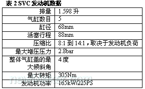 这台小小的1.598升SVC五缸发动机采用机械增压器,大致达到了3.0升自然吸气式发动机的功率和扭矩水平,然而油耗比后者降低了三分之一左右。同样引人注目的还有废气排放方面的优点:二氧化碳(CO2)排放跟油耗成正比下降,而一氧化碳(CO)、碳氢化合物(HC)和氮氧化物(NOX)都满足当今世界上已经生效的以及正在拟议中的一切法律条文的规定。