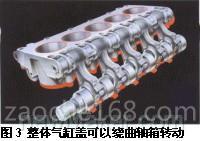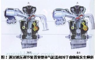 SVC发动机跟传统发动机的主要差别在于,它分割成了上、下两部分。可以通过液压调节装置使上部相对于下部转过一个角度,从而调节压缩比(见图2)。上部叫做整体气缸盖,包含着气缸盖和做成一体的气缸筒,见图3。下部就是曲轴箱,由机体、曲轴、连杆和活塞组成。上、下两部分之间通过橡胶密封件跟曲轴箱隔开,所以不会有机油喷出。跟标准发动机相比,上、下两部分之间的分割面降低了大约20cm。