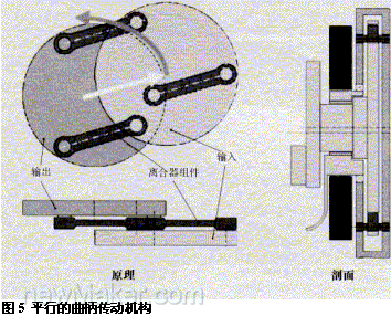 在压缩比的调节过程中,曲轴中心线的位置将发生改变;可是,与曲轴变速器端和前端相连接的其他部件的位置是不变的。因此,专门采用了平行的曲柄传动机构对其进行必要的补偿,这个机构不增加安装空间,见图5。驱动侧的离合器单元也适合于采用双质量飞轮的起动机/发电机或者集成的起动机/发电机。气缸缸数对此影响不大。借助于偏心器调节压缩比的原理也可以用于V形发动机,V形发动机中V形角对压缩比的影响很小,其影响可以通过软件中点火时刻的自适应功能得到补偿。