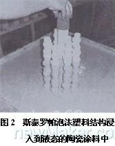 铸件和浇铸系统的模型用0.3至0.5mm直径的聚氨基甲酸乙酯发泡剂(T珠)以5至8%的戊烷作为膨胀剂,通入水蒸气进行预发泡和终发泡而制成。为了实现无障碍的起模,模型由多个部件粘结或者插接而成,一个设在模型中间的直浇口在由多个子模型组成的模型下端与星形的冒口系统相连接。这整个的斯泰罗帕(Styropor,商品名)聚苯乙烯泡沫塑料结构浸入到液态的铸型涂料中,借此形成一层薄薄的陶瓷涂层,见图2。涂料的透气性决定了模型的气化过程。模型烘干后放入浇铸桶,砂子包围在模型的周围后浇铸。马勒气门传动链公司第一根用实型法制成的100 Cr 6铸钢凸轮轴现在正在一家德国的发动机制造商那里进行试验,其壁厚为5至6mm,硬度为HB230。