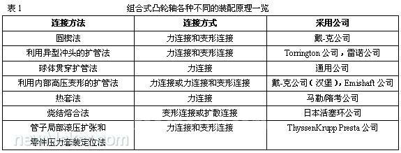 组合式凸轮轴可以采用不同的工艺方法制造。除了列在表1中的方法以外,还有一些其他方法,其中值得一提的有径向螺栓连接的组合式凸轮轴、钎焊凸轮轴、多边形连接法、摩擦焊连接法、粘接连接法或者热套粘结连接法以及各种过盈连接法和楔形连接法。