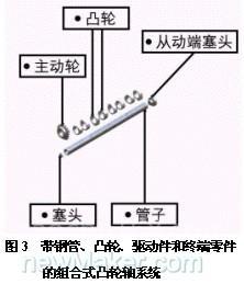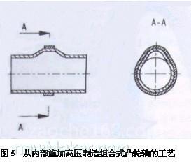 内高压成形(IHU)法,就是将已经淬硬了的凸轮圈以力连接和形状连接的方式与通过内部的高压力变形的钢管制成的轴相连接。见图5,凸轮圈的内部轮廓明显地偏离圆形,以便实现形状连接。通过在凸轮旁边将管子材料往外压出一些而达到凸轮的轴向定位,压出的尺寸是十分之一毫米左右。