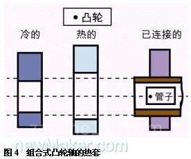 所谓热套法,就是对外部零件进行加热和对内部管子进行冷却,并在NC控制的特种机床上,在短暂的时间间隔中将凸轮和各种零件(轴套、偏心环)先后连接成完整的凸轮轴(见图4)。连接精度为±20~30角度分,轴向尺寸精度为±0.2~0.3mm。凸轮材料(100 Cr 6钢或者烧结材料)可以根据配对的摩擦副材料自由地选择。凸轮只需要很小的磨削量,即使很小的凸轮间距也能够毫无困难地做到。采用精密烧结的凸轮可以完全放弃磨削加工。