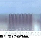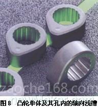 这是德国蒂森克虏伯普里斯坦(ThyssenKrupp Presta)公司的工艺。首先在管子外面滚花加工出圆周方向上的槽子(见图7),凸轮的孔内加工出轴向的浅槽(见图8)。然后将加工好的凸轮套上管子并轴向压入;由于管子外径和凸轮孔之间有过盈,所以当凸轮推入到管子上面之后就会发生塑性变形。管子表面和凸轮孔都有一些锥度,所以压入之后非常牢固。