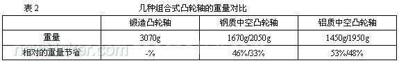 表2反映了几种组合式凸轮轴相对的重量节省量。在采用钢作为中空轴的时候,构件的重量可以减轻到46%,适合于负荷很高的凸轮轴;对于中低负荷的轴来说,可以采用铝作为中空轴的材料,这时凸轮轴的质量甚至可以减轻到53%。此外,组合式凸轮轴还可以对各个零部件和元件采取其他减轻重量的措施,以便进一步减小发动机的运动质量。