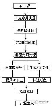 基于原型或实物的逆向工程因其快捷的开发方式,极大地缩短了产品的开发周期,因而在设计和制造领域有着广泛的技术需求。逆向工程通常执行模型的仿制、开发工作。特别是对于没有原始几何信息的零件,逆向工程是完成零件精确几何造型的唯一手段,因而在模具设计和制造中成为技术热点。同时由于逆向工程能够提供原始产品的主要外形特征,进而对其几何外形进行改进,实现产品的快速改形,能够满足系列化、多样化的要求。传统的复制方法是用立体雕刻机或靠模铣床,制作出1:1等比例的模具,再进行批量生产。这种复制方式无法建立工件尺寸的图形文件,也无法做任何外形修改,因此已为数字化的逆向工程系统所取代。目前所称的逆向工程是针对现有工件,利用3D数字化测量仪器准确、快速测量工件的表面点数据或轮廓线条,并加以创建曲面、分模、加工,制作所需模具;或由CAD系统生成的STL模型文件传至快速成型机(RAPID PROTOTYPING MACHINE),将样品模型制作出来,直至达到满意效果。在许多逆向工程应用实例中,并不是要完全仿制原有的产品,而只是要掌握原有的设计理念,经过调整来建立一个类似的设计模型,因此逆向工程所涵盖的意义不只是重制(RE-MANUFACTURING),也包括了再设计(RE-DESIGN),其过程如图1所示。