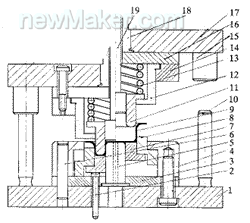 1.底板 2.顶料杆 3.凸模固定板 4.定位套 5.凸模 6.圆柱销 7.内套 8.凹模 9.工件 10导柱 11.弹性凸凹模 12.凹模套 13.弹簧 14.上模固定板 15.导套 16.垫板 17.上模板 18.模柄 19.打料杆