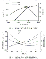 为验证电控系统的控制品质,分别对动力性、经济性和排放特性等进行了试验测量。测试结果显示,在820 r/min的怠速转速下,尾气中CO体积含量为0.08%,HC为80X10-6 , NOX为20×10-6 ;燃用LPG9工况台架试验结果显示,CO的质量排放为20g/(kW·h),HC为6g/(kW·h),NOx为4g/(kW·h),“NO,x+f9为10 g/(kW·h)。图4为电控LPG发动机与原汽油机外特性的对比曲线,图5为部分负荷时电控LPG发动机与原汽油机的燃油消耗率和消耗量对比曲线。