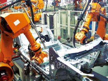 轿车二厂焊装车间现已形成了以KUKA机器人为主,FANUC和SEF机器人为辅,优势互补、功能齐全、高集成化的柔性生产链。