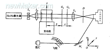 激光莫尔偏折测试系统见图2,波长为632.8 nm的激光穿过扩束镜L1后变为一宽光束, 经准直镜L2后成为一束平行光穿过涡流室的观测窗,然后在相互偏转一角度θ的一对Ro nchi刻度光栅G1、G2后形成莫尔条纹,再由聚焦透镜L3成像及小孔光阑D滤波,把 经过光栅副之后的+1(或-1)级莫尔偏折条纹成像在高速摄影机胶片上,高速摄影机同时 记录下相应的曲轴转角。