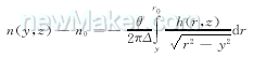在图2中建立坐标系,取涡流室轴线方向为z轴,光束传播方向为x轴,按右手规则 确定y轴。我们从拍摄的莫尔条纹图中,通过判读每一条纹各点处的漂移量h,可以得知光线 相应的偏折角,该偏折角与折射率有关[7]