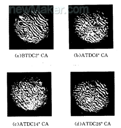 图4为具有代表性的4个曲轴转角下涡流室内的莫尔条纹照片。图5为发动机相同工 况时涡流室内燃烧过程的高速摄影照片。