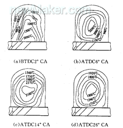 结合图5的高速摄影结果可以很好地解释燃烧过程涡流室内温度分布的这种变化规律。 上止点前4° CA稍后,涡流室底部通道口处首先着火,此时涡流室中上部的气体还未被加热 。上止点前2° CA时,底部通道附近的火焰已扩大,在通道口处形成高温区,由于燃烧初期 火 焰没有明显的旋转运动,涡流室内的热力混合效应较弱,中上部的气体受底部高温区的辐射 换热和弱对流换热作用而温度有所升高。随着燃烧的继续,燃烧火焰迅速卷向涡流室中心, 并传播到整个燃烧室,在上止点后6° CA左右火焰高温区已位于涡流室的中心,此时壁面 附近 的气体由于受壁面的冷却作用而温度相对较低。在燃烧过程中期,受涡流室内旋转涡流的影 响,燃烧产物由于其密度较小被卷向涡流室中心,密度较大的未燃混合气在由涡流室中心卷 向外侧的同时继续燃烧,火焰呈螺旋辐射状,形成了如图6c所示的一圈环状高温带。燃烧 后期,更多的燃烧产物被卷向涡流室中心,外移的新鲜空气和壁面附近的浓混合气相遇后又 继续燃烧,高温区相应地外移到壁面附近,直到上止点后38°CA时火焰才基本上从涡流室中消失。