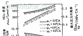 图3为燃烧始点φi对NOx及性能的影响。当工况一定时,存在一个最佳着火时刻φi。随φi前移最高燃烧压力pmax及压力升高率dp/dφ增大,火焰温度升高及高温持续时间加长,这使得N2分子更易于分解。所以,NOx的排放指标将急剧增加。而随φi后移最高燃烧压力pmax及压力升高率dp/dφ减小,火焰温度变低,虽然扩散燃烧的加大也会使高温持续时间加长但由于缺氧会使得N2分子不易于分解。所以,NOx的排放指标会有所降低。