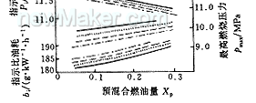 由以上模拟可知四种因素对柴油机性能的影响。图2及表2为上述四个因素对性能(指示比油耗bi、最高燃烧压力pmax、最高压力升高率dp/dφ、指示功率Pi)的影响。由图2可知,当Xp一定时,φe小者经济性及动力性较好,但工作较粗暴,而随Xp增加其性能变坏,这是因为计算时采用了同一着火始点,Xp大者必定在上止点前造成较大的压缩负功损失。从图2与表2可看出,在一特定的着火始点下会出现较好的性能。采用较大压缩比并同时推迟着火角是一种既可保证良好的经济性、动力性及排放指标,又可使其工作趋向柔和的有效措施。这一点已在试验中得到证实。