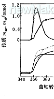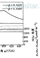 图4为掺混系数β对传质及NOx生成过程的影响。随β值的加大,由空气区进入燃烧产物区及由燃烧产物区进入喷雾区的传质量增加。这样,燃烧产物区由于掺进了较多冷空气又传出了较多的热气体而使其温度大大降低。这虽对燃烧模拟无甚影响但却对NOx的产生有较大影响。表明当燃烧产物区温度由2000K升高至2500K时,氮氧化物生成反应速率将增加43.5倍。由图可知即使β值仅有0.2%的变化也可引起NOx高达15%~20%的变化。目前的情况表明仅75%的工况可将其模拟误差控制在±1%内。误差的原因主要是由温度误差引起。所以,如何精确地确定掺混系数β仍需进一步的研究。