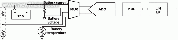 持续不断的监视对于电池的条件来说非常重要,这关系到汽车的可靠性。现在的汽车十分依赖电子产品同时也是对电池的依赖。每5辆报废的汽车中就有一辆是由于电池的原因造成的。近些年来,当像电传线控,发动/熄火引擎管理和液压(电子/气体)助力这些系统汽车技术普遍使用时,这个问题变的越来越严重。降低错误的数量,需要精确的感应到电池的电压,电流和温度;对结果进行预处理;计算电荷状况和性能状况,将结果发送到ECU;然后控制充电功能。