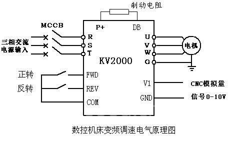 2)5.5kW数控车床 电动机参数:额定功率:5.5kW,额定频率:50Hz, 额定电压:380V,额定电流:13A,额定转速:1400r/min 机械传动比:1:1.5 加工材料:45#钢 实际测试性能指标:主轴转速:200r/min(变频器运行频率9~10Hz), 进刀速度:60mm/min, 单边进刀量:2mm;主轴转速:450r/min(变频器运行频率22Hz左右), 进刀速度:60mm/min, 单边进刀量:4mm,运行的效果很好,实际的进刀速度和单边进刀量还可以加大。 客户选配电机为3.7KW/50Hz/380V,选用变频器型号为KV2000-G0037C-4T,制动电阻1000瓦/100欧姆。