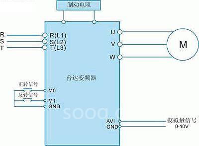 变频器AVI/GND端子提供与数控系统速度模拟量,AVI接数控系统模拟量接口正信号,GND接负信号,信号为0-10V模拟电压信号,控制主轴转速。M0/M1/GND为变频器的正转/反转信号端子,通常由数控系统发出正转信号FWD或者反转REV,来驱动中间继电器,中间继电器的常开接点接入变频器M0/GND或者M1/GND,从而控制变频器的正反转。