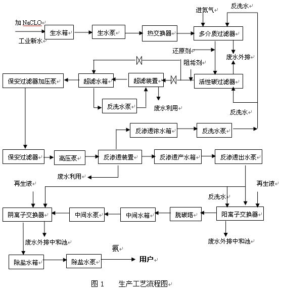 除盐水改造后的生产线主要设备有6个多介质和6个活性炭过滤器,超滤装置,反渗透装置,脱碳风机,阴离子和阳离子交换器,以及生水泵3台(1台变频),高压泵6台,4台除盐水泵(1台变频),反渗透出水泵3台(1台变频)等。生产工艺图见图1: