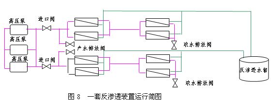 反渗透工艺是一种在压力驱动下,借助半透膜的选择截留作用,将溶液中的溶质与溶剂分闪的分离方法。在水处理工艺运用中,将水中无机离子、细菌、病毒、有机物及胶质等杂质去除,以获得高质量的水。系统对反渗透装置的控制有三种工作状态:运行、备用、冲洗。反渗透装置有3个由电磁阀控制的阀门,反洗进口阀、产水排放阀、浓水排放自动阀。反渗透装置运行简图见图8: