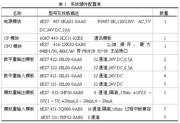 本系统是建立在S7-400控制器、DELL 的Pentium工控机平台之上的分布式系统。S7-400是模块化PLC系统,采用标准的以太网通讯,每个控制器可以控制64个回路,最大的可处理131072个I/O点,其中模拟量I/O点数为168个,逻辑扫描率为1.25MB/S。S7-400与上位机采用工业以太网,通讯速率为100Mbps。系统主要硬件配置和I/O点数统计见表1和表2,系统配置结构见图2: