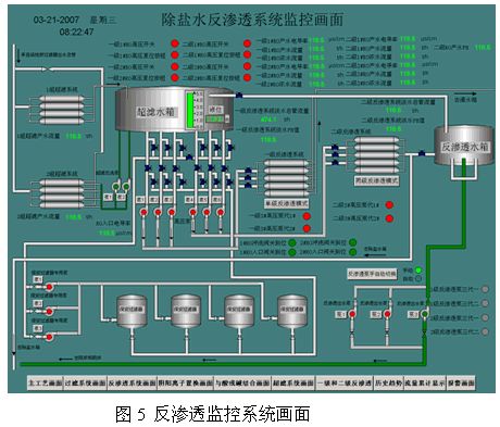 根据除盐水生产工艺,监控系统的功能主要是实现对工业新水的加药、过滤、超滤、反渗透技术、阴阳离子置换、酸碱作用等控制工序,大致可分为过滤系统、超滤系统、反渗透系统、阴阳离子置换系统、与酸或碱结合系统5个子系统,系统监控主画面及分系统画面见图3、图4、图5:
