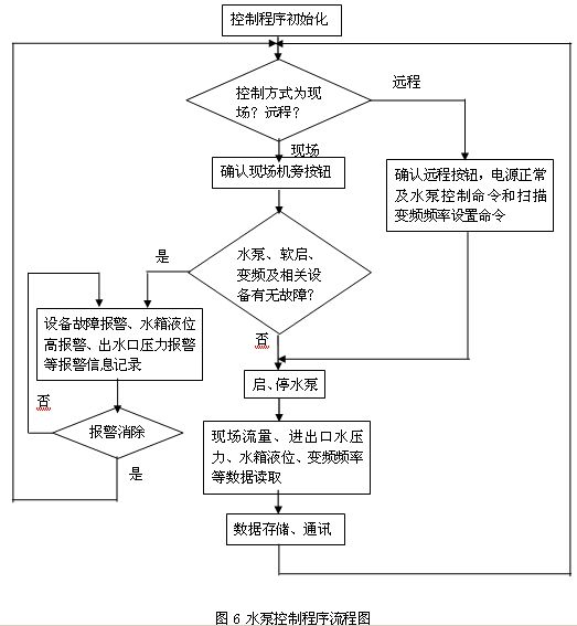 因为除盐水的生产不是连续生产方式,并且其产水量经常根据锅炉系统的负荷调整进行调整,所以生产设备(水泵)的控制方式应该能够适应多种情况下的生产方式,如一用一备、两用一杯等不同工况。水泵控制程序流程图见图6: