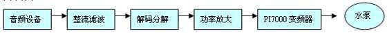 利用音乐的音频信号对变频器进行控制,即通过音乐电平对数字音乐信号进行解码分解后再转换成4~20 mA标准模拟量信号送入变频器模拟量输入接口,通过此信号控制变频器响应音乐的变化,再由变频器输出到相应并联的泵群中,即可以实现音频信号对变频器的控制,从而达到水柱水流随着音乐的变化而变化的目的。