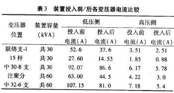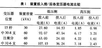 (1)集中补偿时:通过现场采集的数据计算,可得出表1中所示的低压侧与高压侧在投人装置前、后所对应的电流值。