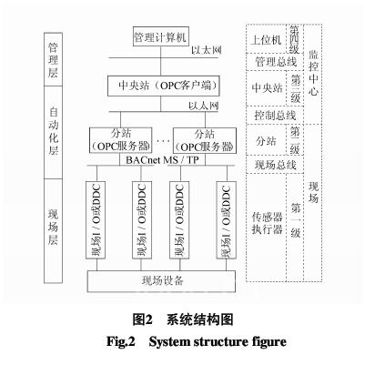 在甘肃省博物馆展览大楼主体楼中,共有三层展厅,四层和五层为办公室。楼宇自动化系统包括:各展厅、陈列室、报告厅全空气中央空调系统,四、五层新风盘管系统,以及热交换系统、给排水系统及电梯、照明系统。在此系统中共设置584个检测、控制点(其中AI/128点,DI/236点,AO/57点,DO/163点)选用加拿大DELTA控制公司的楼控产品,采用BACnet网络协议,对博物馆楼宇自动化个子系统的运行状态进行监视和控制,采集并记录相关参数,由于该系统的设备多样,因此提出了基于OPC技术的三层四级的网络结构,如图2所示。