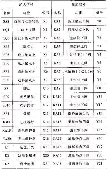 根据精密油压机运行控制技术要求,输入信号19个,输出信号19个,因此,该设备选用口本三菱公司生产的FX2N-48MR可编程序控制器。其1/O分配如表1。