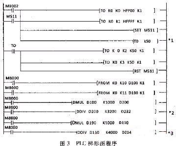 程序中主要控制各个阀的通断来控制整个油路系统,从而控制整台油压机的动作由于该部分程序较长,此处没有列出。程序还包括主缸、液压垫位置的采集,位置的采集是利用直线位移传感器,用FX2N一8AD来处理采集到的信号,通过FX2N-8AD的缓冲存储器(简称“BFM”)来完成FX2N一SAD和PLC主单元之间的数据传输。使用FROM/TO指令来读写BFM和PLC之间的数据。PLC梯形图程序如图3所。模拟量输入模块数据处理的程序如下: