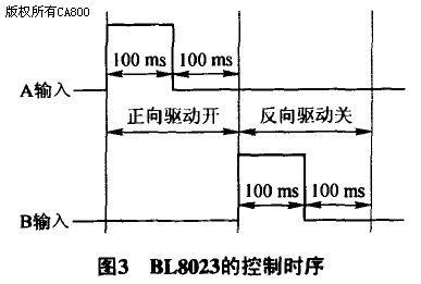 当一个系统只用几个磁保持继电器时,可采用BL8023实现简单驱动。BL8023是双向继电器驱动集成电路,用于控制磁保持继电器的工作,具有输出电流大,静态功耗小的特点,其内部结构框图如图2所示。BL8023的输入端A、B源于I/O口脉冲信号控制,该脉冲信号的宽度及脉冲间隔保持100 ms左右,BL8023的输出端OA和OB接磁保持继电器线圈,BL8023的控制时序如图3所示。控制1只磁保持继电器至少需要4条接线,电源线、地线、输入线A~ 正向驱动、输入线B一反向驱动(如图2所示)。如果控制Ⅳ只磁保持继电器至少需2Ⅳ条线,其中电源和地线公用,如果控制系统磁保持继电器数量较多时,会有引线数量较大、控制电路体积较大的弊端。