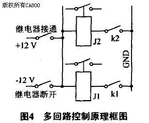 如果控制系统有大量的磁保持继电器需要控制时,需要注意结构组装等条件限制,为了实现接线简单、结构紧凑、控制板模块化,需对控制电路进行优化设计。在JXD-240型限电计费装置中,采用了如图4所示的控制原理:当某个磁保持继电器需要动作时(接通或断开),首先将对应的开关K接通。这时磁保持继电器的一端与电源地线相连,而另一端与浮动的电源总线相连。如果浮动的电源总线与+12 V相连,则继电器实现接通动作;如果浮动的电源总线与-12 V相连,则继电器实现断开动作。脉冲宽度和脉冲之间最小间隔,仍然保持100 ms以上。采用这种结构,帜继电器只需Ⅳ+1条连线。