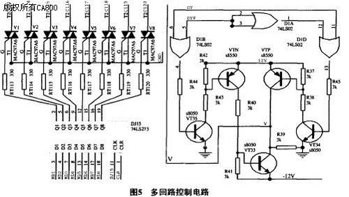 为了实现图4所示的控制,采用了如图5所示的具体电路。8D触发器74LS273输出的每bit位可控制一只继电器。当273某一输出脚为高电平时,其输出短路驱动电流可以达到60mA.磁保持继电器采用BST一902型,其额定电流为80mA,而可控硅MAC97A6是电流控制型,实际的触发电流应是负载电流的1/10至1/3之间。由于器件一致性较差,为了保证批量生产的成品率,应取最低指标进行设计。这样I/O口高电平可使双向可控硅可靠导通,由于双向可控硅导通后等效成一只无触点开关,使继电器的一端与地接通,这时电源输出端只要加上相应电压就会使继电器产生相应的闭合、断开动作。